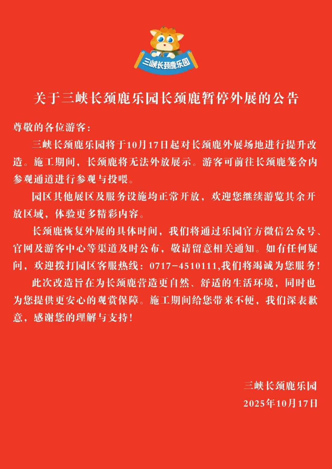 發布日期:2025-10-17 來源:三峽長頸鹿樂園 編輯:宜都融媒體